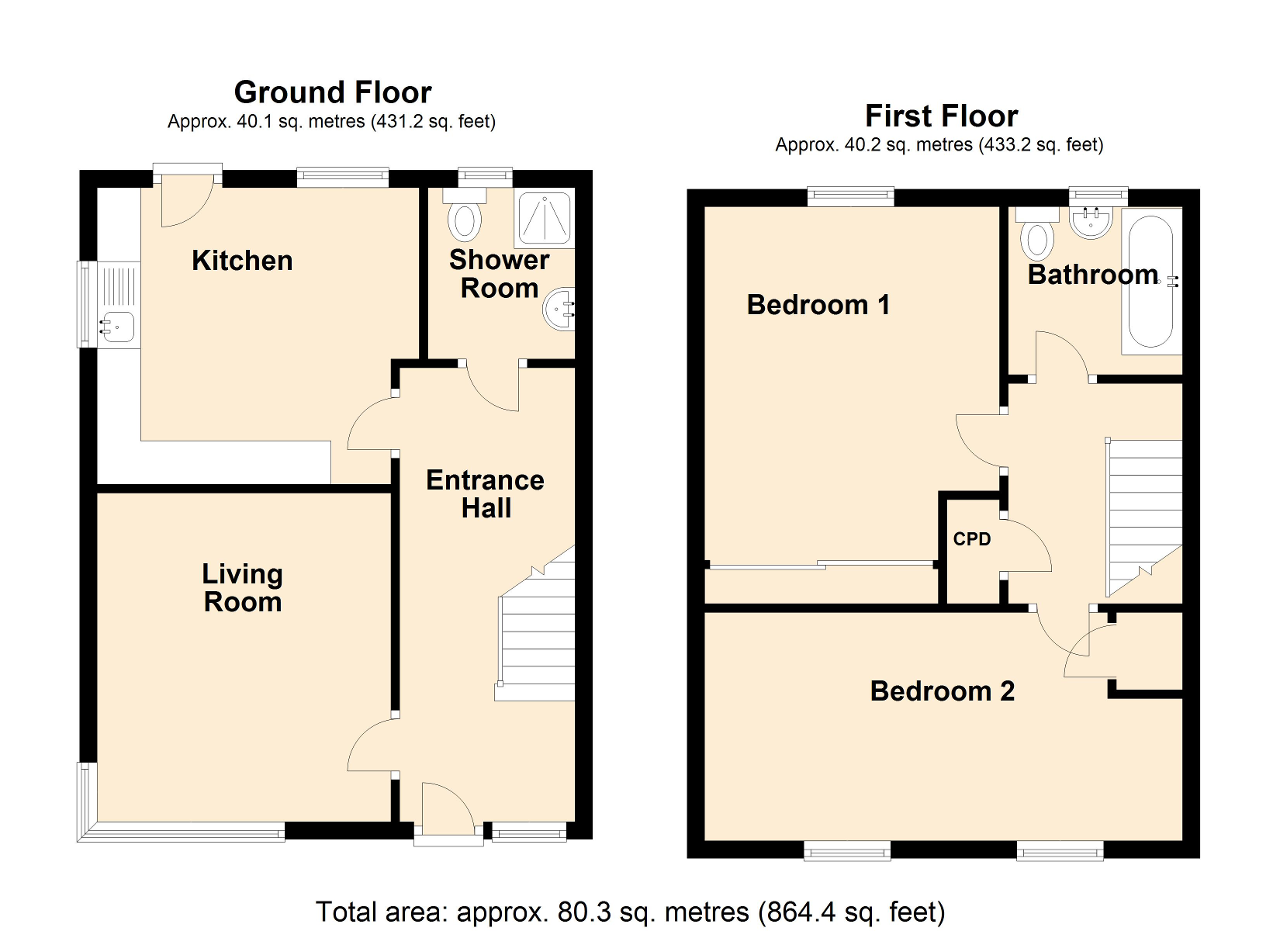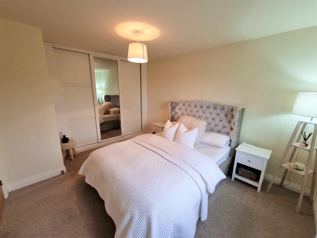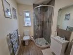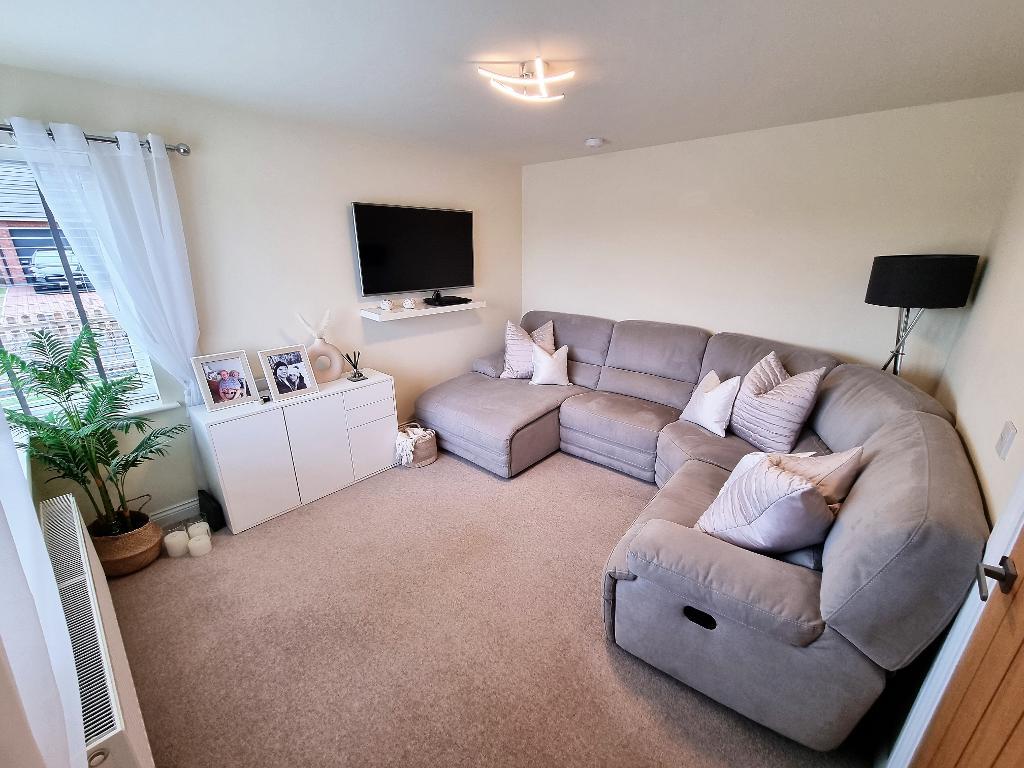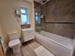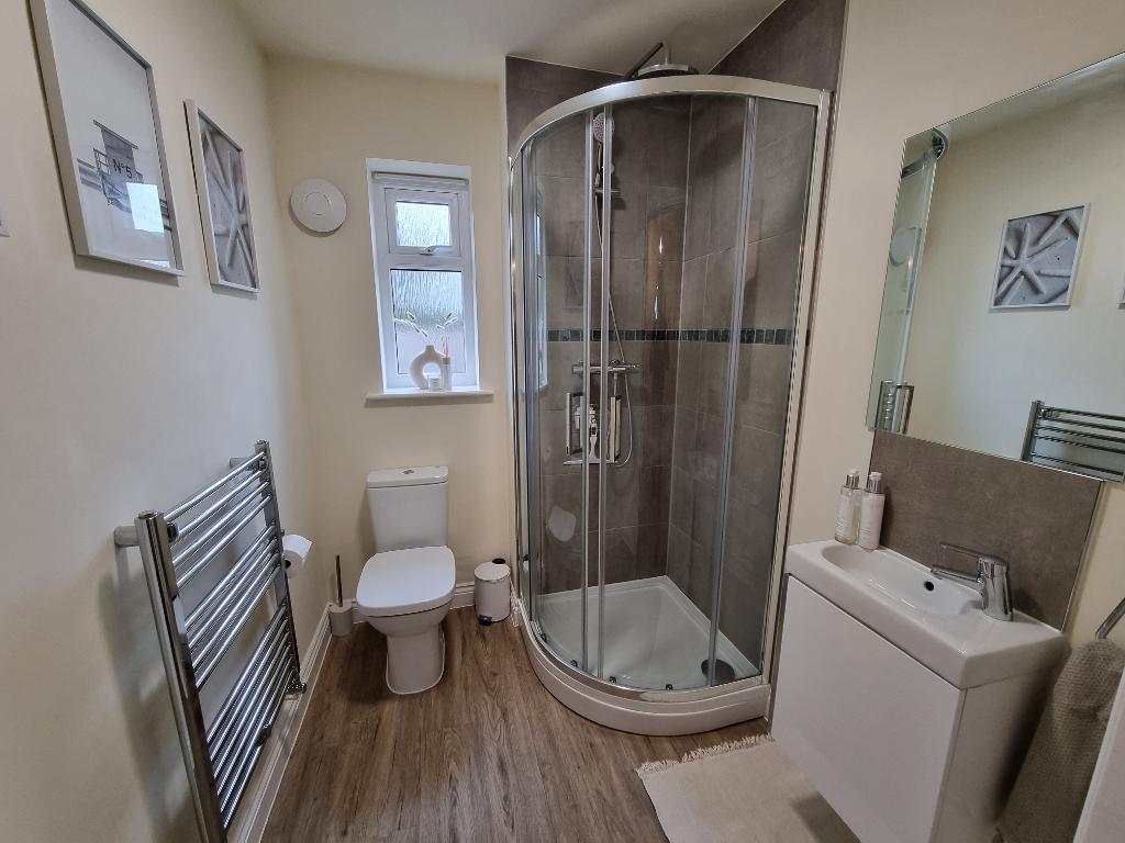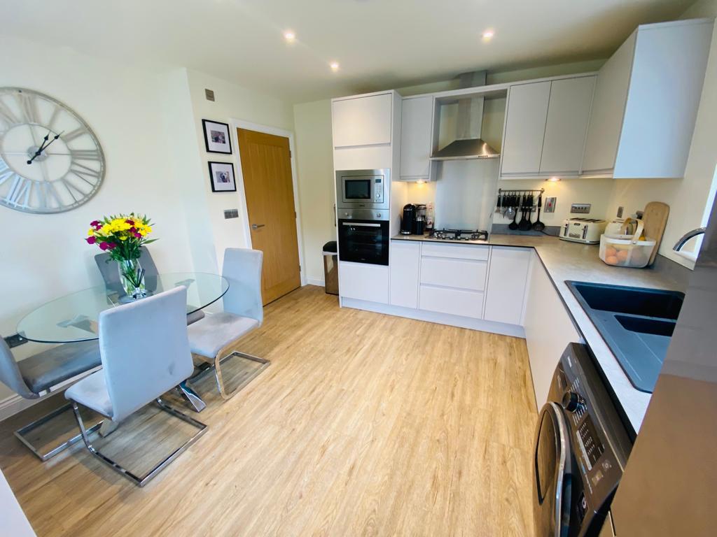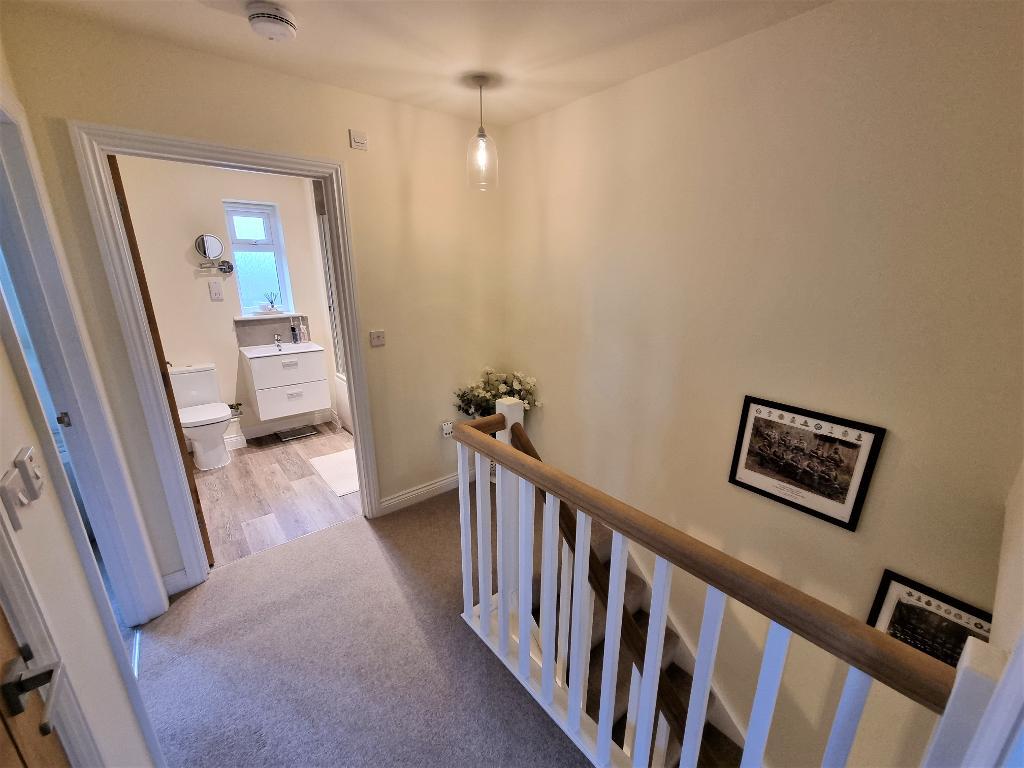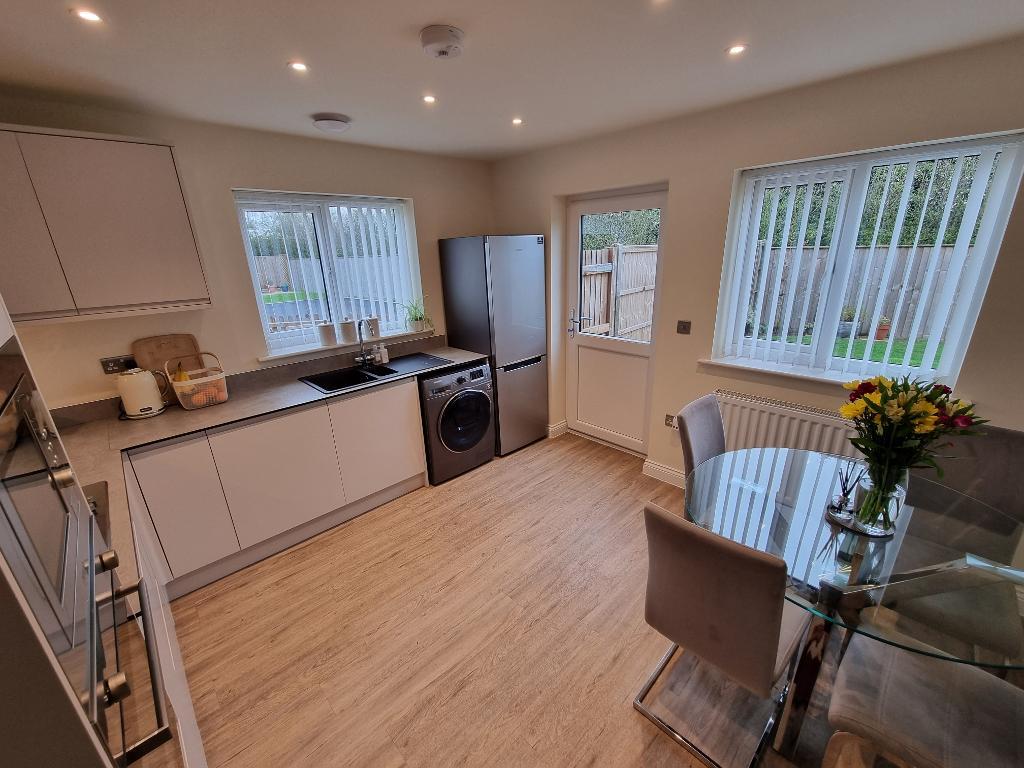 The property itself is approached over a double width driveway leading to the entrance door which in turn leads into a generous entrance hallway with stairs off to the first floor, useful under stairs storage and doors off to the principle rooms. The living room is a light and airy space with large feature window to the front, TV point and radiator, The dining kitchen is well fitted with range of base and wall units with work surfaces over, fitted appliances of microwave, electric oven, gas hob with hood, plumbing for washing machine and doors and windows to the side and rear spotlights and ample space for dining/entertaining. There is a very well appointed ground floor shower room which has a WC, wash hand basin with vanity unit, chrome heated towel rail and window to the rear. The stairs take you to the first floor landing which has an airing cupboard and loft hatch with doors off to 2 double bedrooms, the principle room having fitted wardrobes, and the second bedroom having two windows to the front and useful built in cupboard. The family bathroom is fitted with bath, with shower and fitted screen, WC and wash hand basin with vanity unit, again with chrome heated rail and window to the rear, all benefiting from double glazing and gas fired central heating throughout. The property has the added benefit of the remainder of the LABC builders warranty, (approx 8 years).