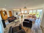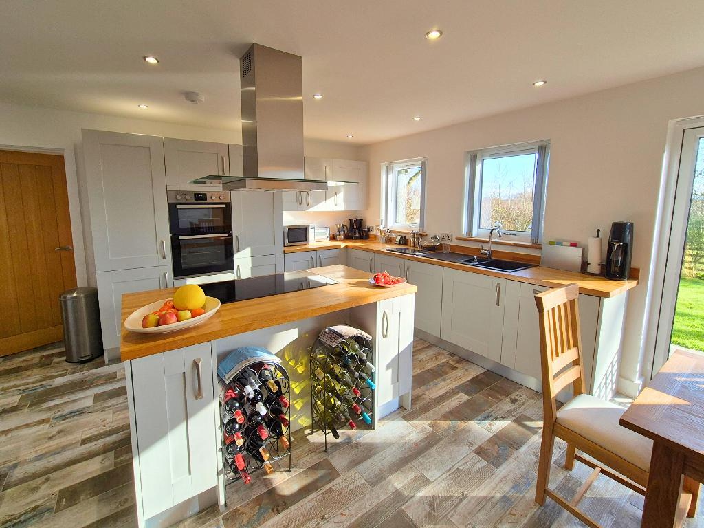 The property is approached over a private driveway leading to an entrance porch with further doors leading into the open plan living, dining, kitchen. This is a fantastic space offering lots of natural light and having ample space for dining/relaxing. The well appointed kitchen includes fitted base and wall units and a central island with work surfaces over, appliances of dishwasher, fridge freezer, double ovens and AEG hob with fitted hood. There is also a sink drainer unit with mixer taps, spotlights with tiled flooring throughout and doors opening onto the rear gardens. The spacious design gives buyers the choice of a number of configurations to suit a new buyers needs and works brilliantly as a family living kitchen or for entertaining. The ground floor benefits from underfloor heating throughout, and the staircase rises to the first floor from this room also.