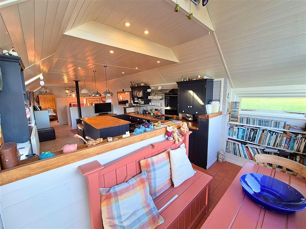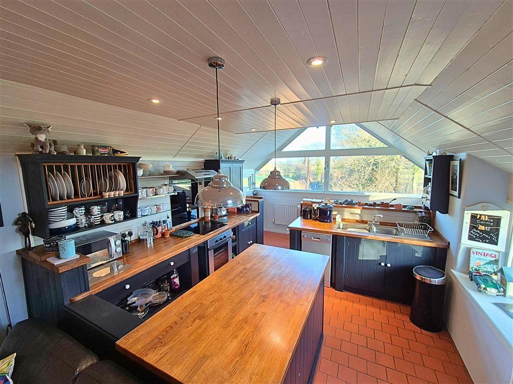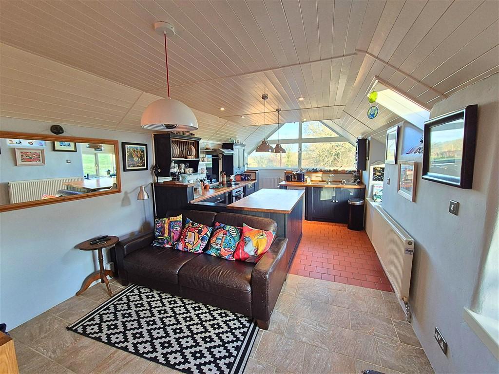 The property is approached along a quiet lane and has a gravelled driveway to the front with doors leading into the property to the side and rear. The rear door leads into the hallway with stairs off to the first floor and understairs storage. The layout of the cottage has the first floor as open plan living/kitchen which has large glazed windows with stunning countryside views. There is a handmade kitchen which comprises base and wall units, a central island with sink unit, electric oven and hob and space for further appliances. This space also incorporates a dining area which takes full advantage of the wonderful views. The living/relaxing space has a fitted multi-fuel burner with space for sofas and a secluded area which is currently used as a bedroom having space for a double bed and furniture. This space is bright yet cosy and a lovely feature of the property.