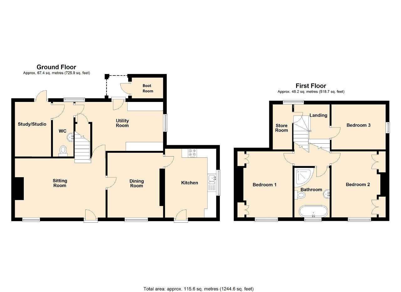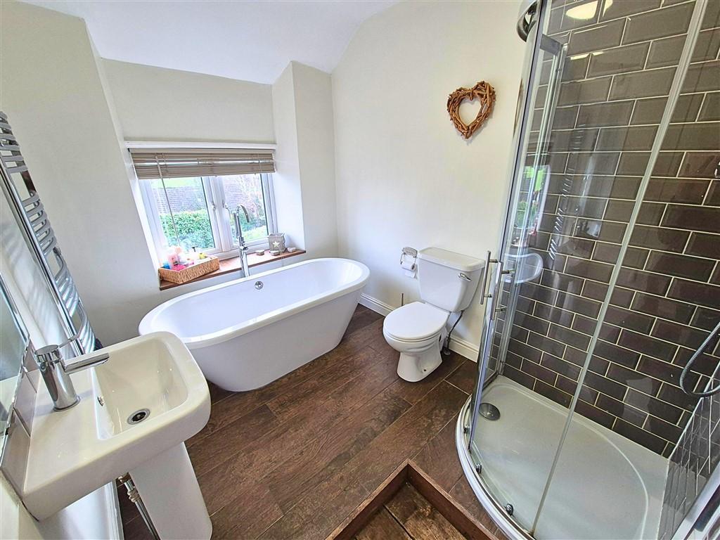 The stairs take you to the first floor landing which is full of character with elm floorboards, loft hatch and a door off to a small dressing/storage room.. The property boasts three first floor bedrooms with the two main rooms having built in wardrobes. The third room also takes a double bed comfortably and has beams and window to the side. This bedroom does have some limited head height in areas. The family bathroom has been refitted to offer a suite of a stand alone bath, wash hand basin, WC, a separate shower cubicle with metro tiling, hard flooring, chrome heated towel rail and window to the rear.