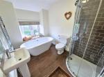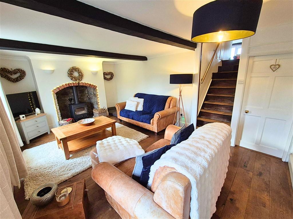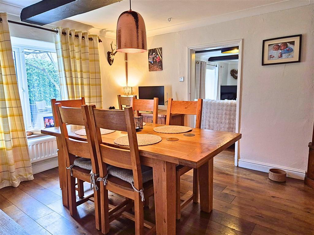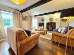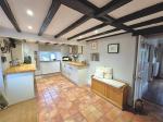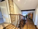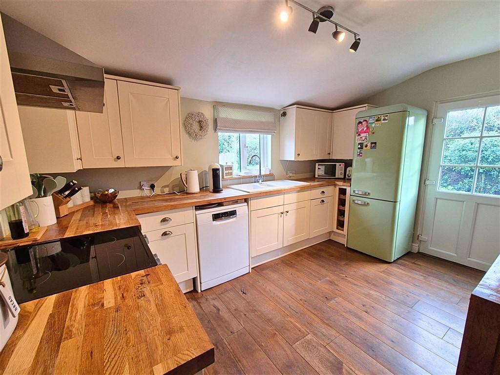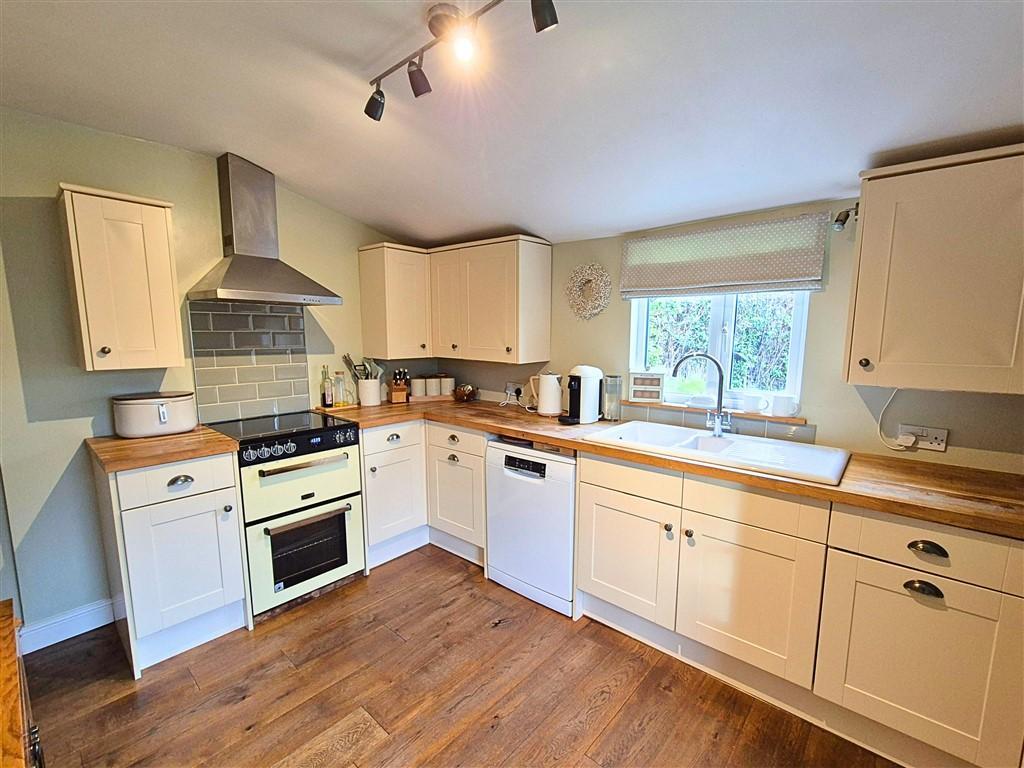The living room room is a large yet cosy space with doors and windows overlooking the gardens, Oak flooring and a feature fireplace with Clearview stove and exposed timbers and stairs up to the first floor. The dining room is adjacent to the kitchen and again offers character and ample space for dining/relaxing with windows to the rear and wooden flooring. The kitchen is fitted with a range of base and wall units along with an enamelled sink, electric cooker and fitted hood, plumbing for dishwasher, Oak flooring and window and door into the gardens.