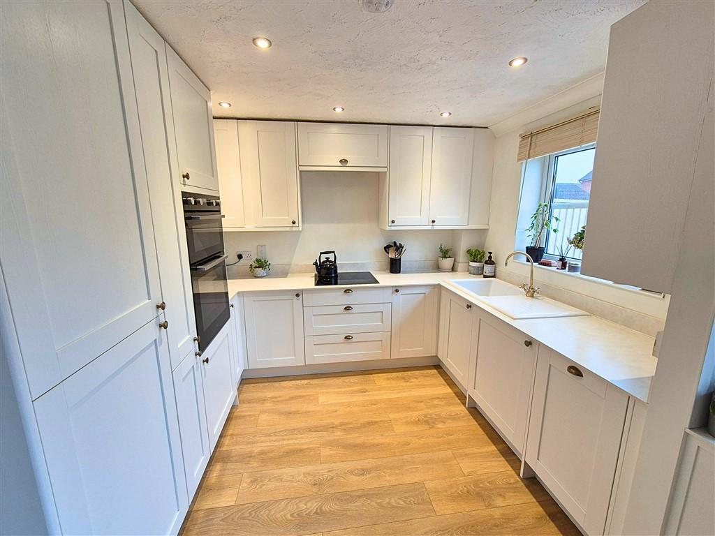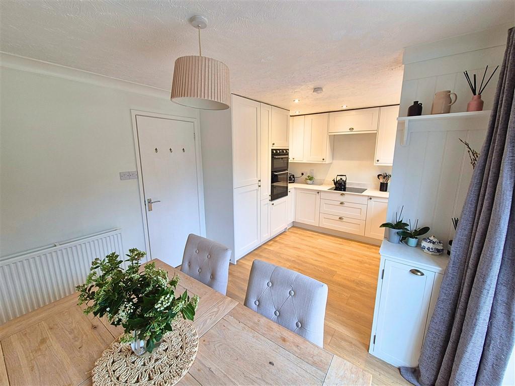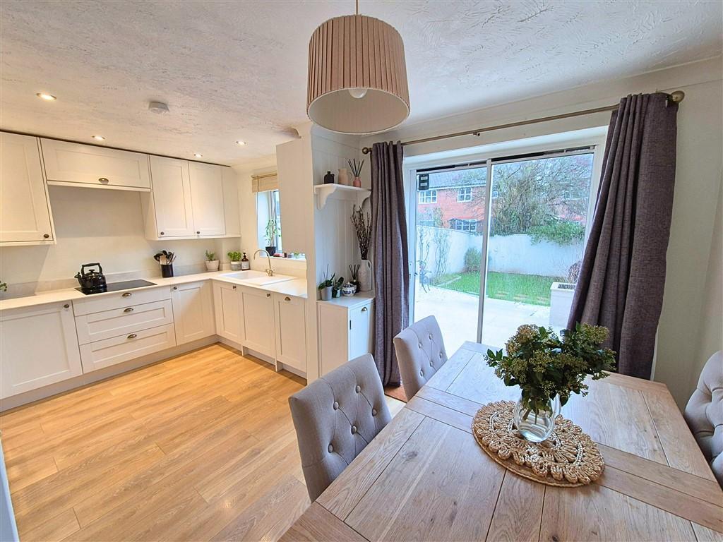 The property is approached over a fore garden with ample driveway parking to the side and entrance door leading into the hallway. The hallway has stairs off to the first floor and door into the cloakroom with WC and wash hand basin with half panelling to the walls. The living room is a lovely relaxing space with window to the front, a built in under stairs storage cupboard and fitted fireplace with inset gas fire. A further door leads into the newly appointed dining kitchen which is light and modern and has a good range of base and wall units with work surfaces over and includes a range of built in appliances to include a double oven, electric hob, cooker hood, integral fridge freezer and dishwasher. There is also an enamelled sink drainer, spotlights with window overlooking the rear and a good size dining area with ample space for table and chairs and patio doors opening out onto the gardens making this a great socialable space, perfect for entertaining.