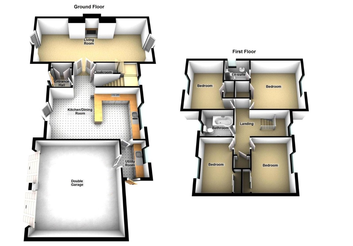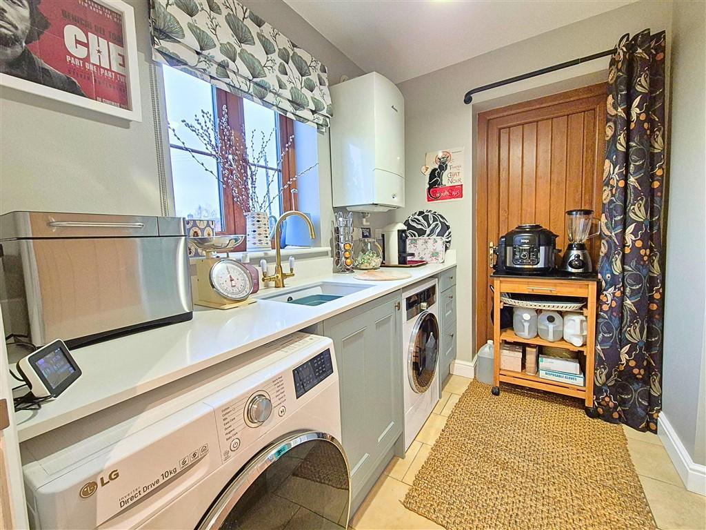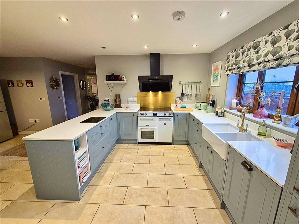 The property is approached over a block paved driveway with canopied porch which leads into the hallway. The hallway has wooden flooring, useful cloaks cupboard and further door leading into the inner hallway. The inner hallway has stairs off to the first floor, a cloakroom with WC and wash hand basin and leads you to the main living rooms. The open plan kitchen/dining/living space has been re-modelled to offer a well appointed kitchen having a stylish range of base and wall units with composite worktops, breakfast bar area, pull out larder cupboards, dishwasher, double Belfast style sink and range cooker with fitted hood. There is ample space for dining and relaxing with windows to the front and doors out onto the gardens. The utility room is off the kitchen and has base units with plumbing for a washing machine and space for a tumble dryer and houses the gas central heating boiler, with window and door to the side.