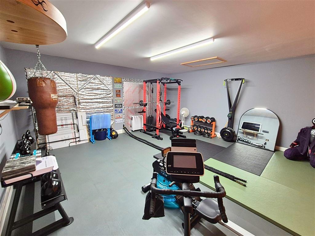 The property has a large double garage with two double up and over doors to the front, it is fitted with light and power. It is currently being used as a gym, but could easily be used as a garage as required by the new buyers.