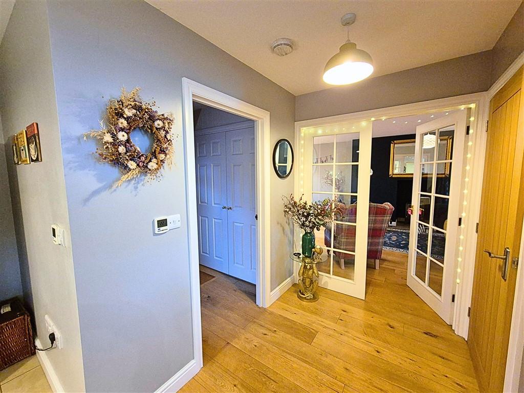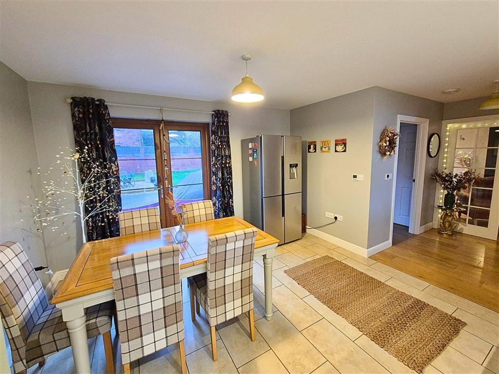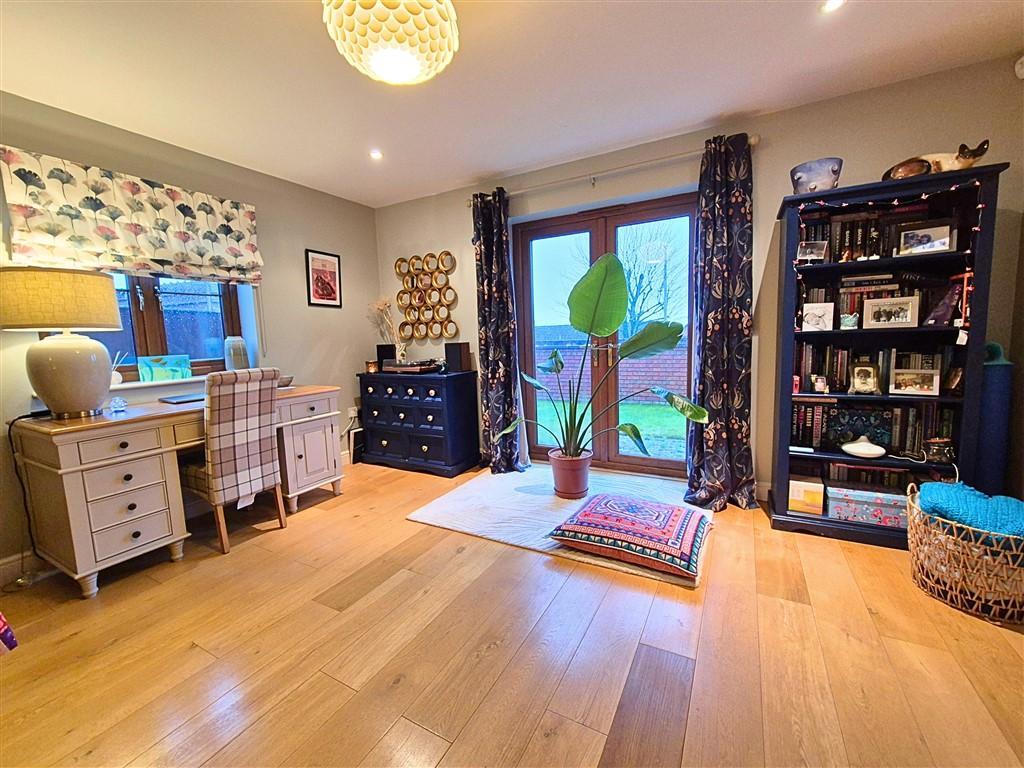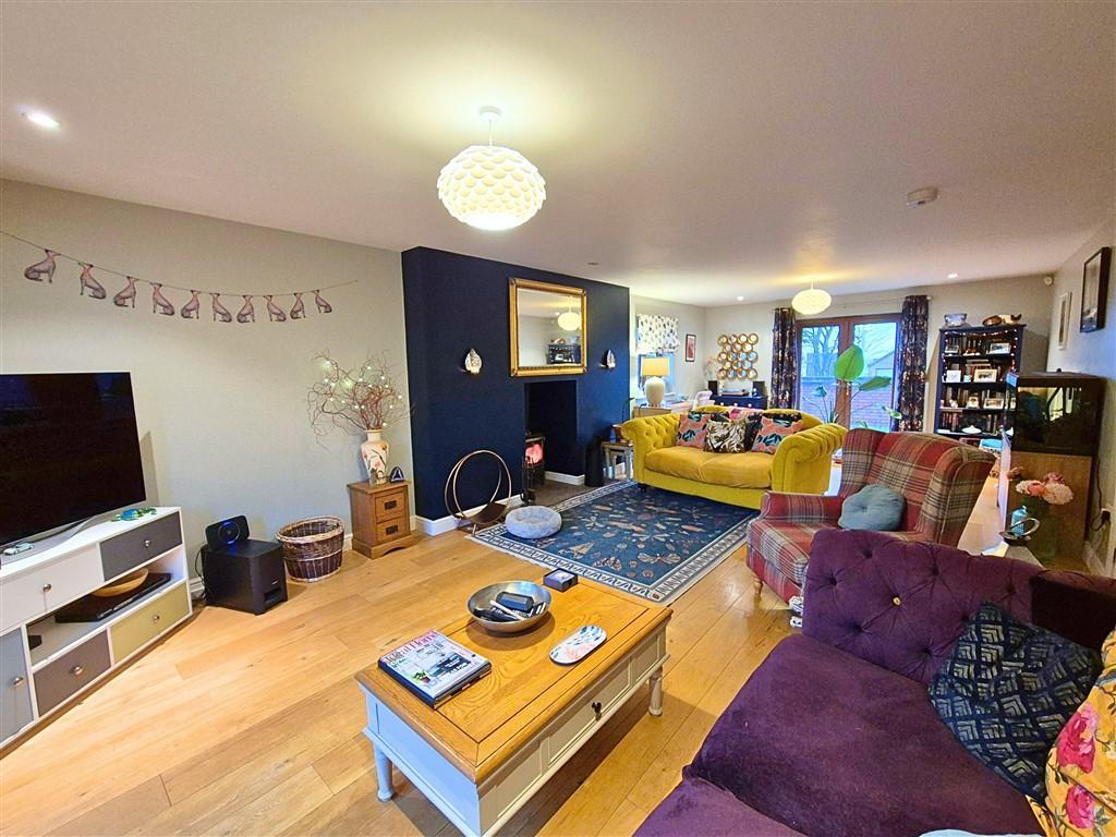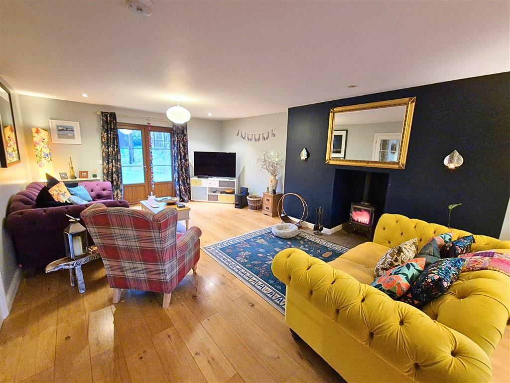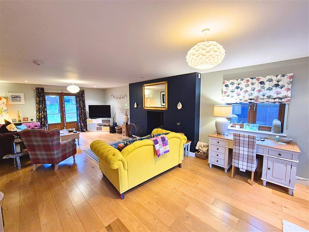 The living room is a large room with focal fireplace with inset wood burning stove and wooden flooring throughout. The room is very generous with space for furniture, dining or relaxing as required. It has windows to the front and doors out onto the gardens provides ample natural light.
