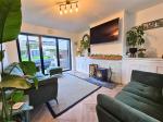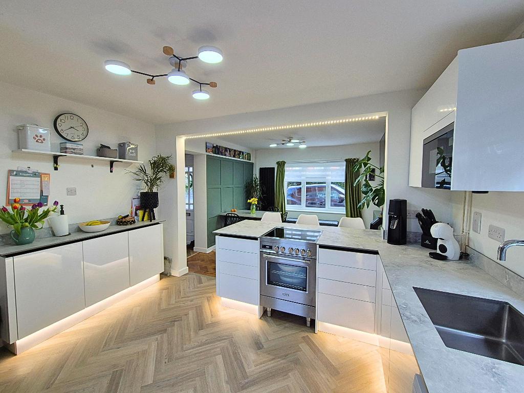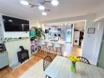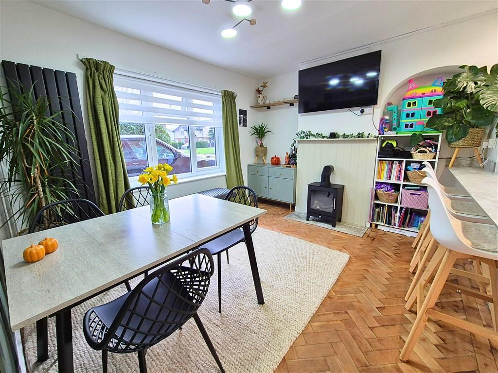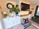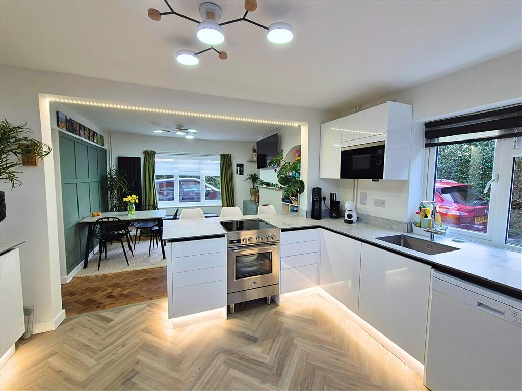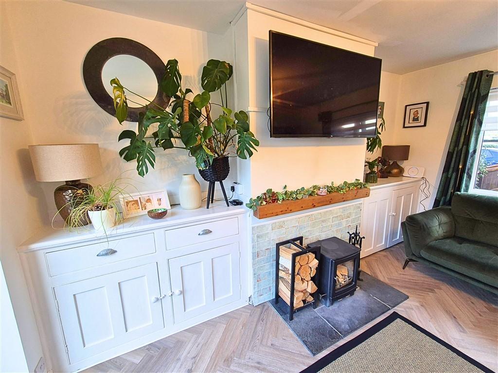 The property is approached behind a mature hedge with driveway parking to the side and entrance door leading into the hallway. The entrance hall has stairs off to the first floor, hard flooring and further doors communicating off. The living room is a lovely light space with bi-fold doors opening onto the gardens with windows to the front and feature fireplace with inset wood burning stove. There is panelling to the walls, built in storage cupboards and herringbone style flooring.