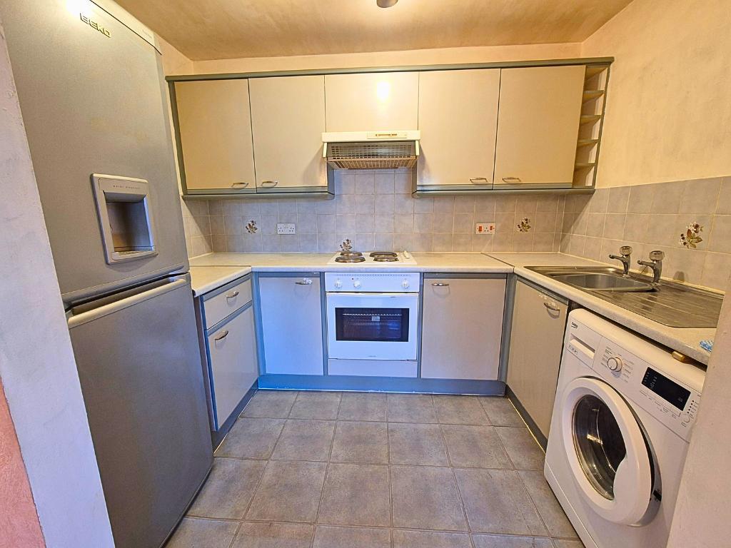 The living room is a grand open space with vaulted ceiling and a large three pane sash window with lovely views over the river. Having ample wall space for decor and stair that rise to the bedroom. The kitchen is off the main living area and is fitted with base and wall units with work surfaces over, sink drainer, electric oven & hob, plumbing for washing machine, space for fridge freezer, tiling and spotlights.
