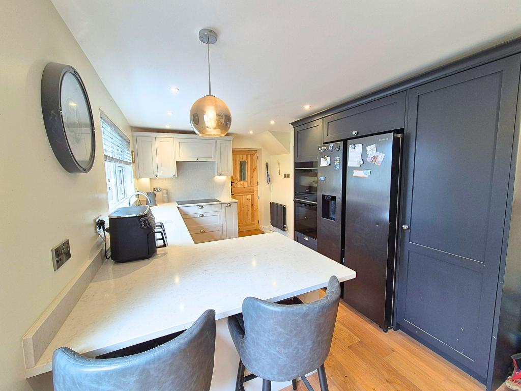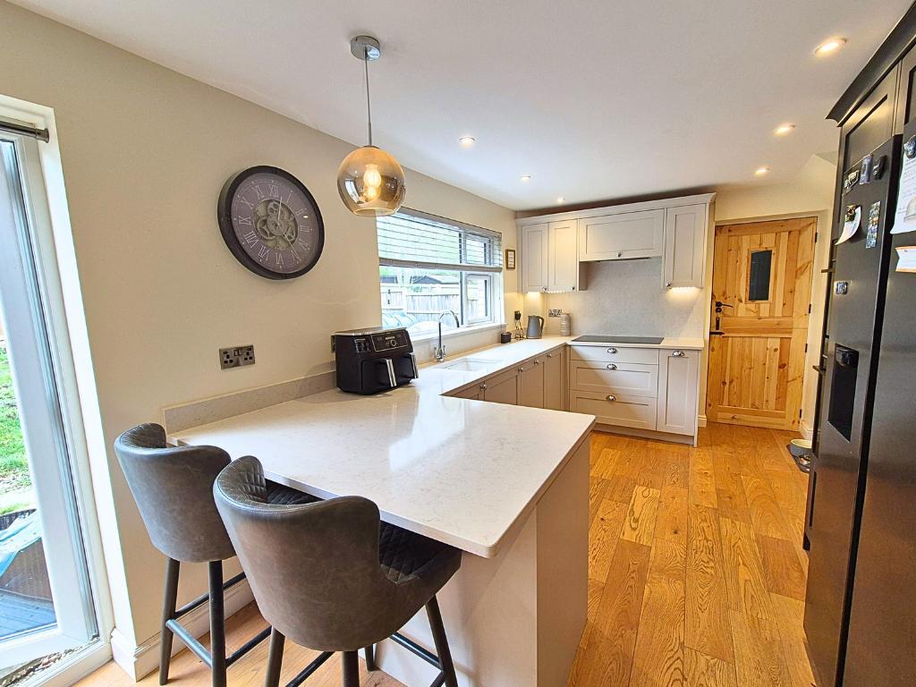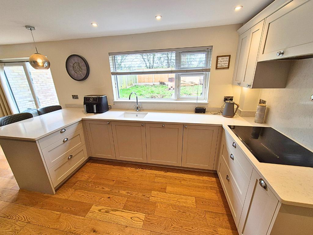 The property is approached along a quiet no through road, leading to a large fore garden and ample vehicular parking leading to the entrance door. The entrance hall has stairs off to the first floor, storage cupboard and understairs storage with wooden flooring. The living room is a good size with window to the front, fireplace with inset fire and having wooden flooring throughout. The kitchen/diner has been re-fitted with a modern range of base and wall units with granite style work top with breakfast bar, fitted induction hob and hood, electric double oven, carousel units, larder /tall units, built in bin and space for large fridge freezer. Having wooden flooring, ample space for table & chairs and a door and window opening onto the gardens. Side doors lead into the lobby area with a cloakroom with WC and wash hand basin, and housing the oil central heating boiler. There is a useful laundry cupboard with plumbing for washing machine.