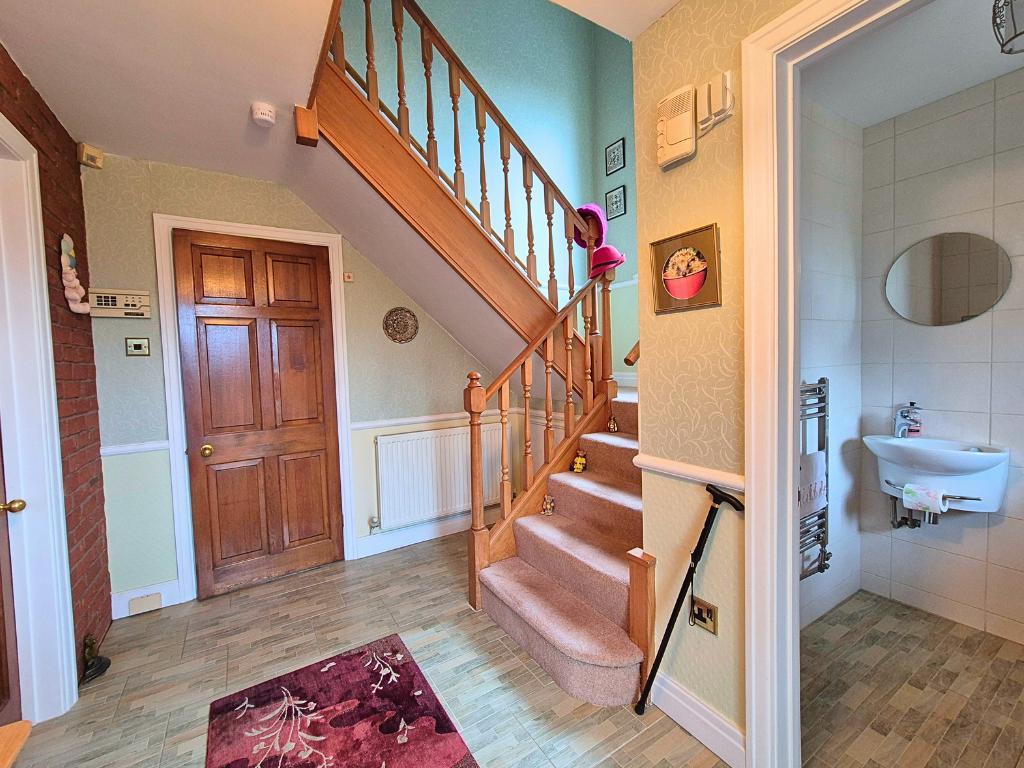 The property is approached over a large gravelled driveway with ample vehicular parking and fore gardens planted with maturing shrubs and flowering plants with wall and hedge to the front providing extra privacy. The entrance door leads into the reception hall with stairs off to the first floor and giving access into a cloakroom with WC and wash hand basin.
